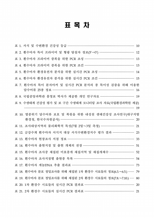 표 목 차 표 1. 서식 및 수변환경 건강성 등급 ····················································································· 10 표 2. 흰수마자 특이 프라이머 및 형광 탐침자 정보 5‘→3’ ············································ 12 표 3. 흰수마자 프라이머 증폭을 위한 PCR 조성 ······························································· 13 표 4. 흰수마자 프라이머 증폭을 위한 PCR 조건 ······························································· 13 표 5. 흰수...