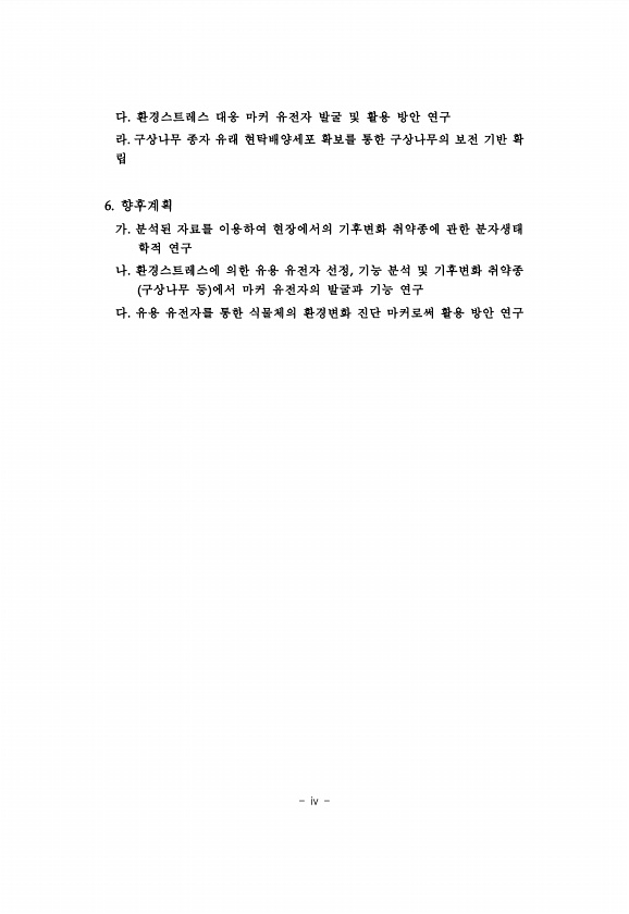 iv 다. 환경스트레스 대응 마커 유전자 발굴 및 활용 방안 연구 라. 구상나무 종자 유래 현탁배양세포 확보를 통한 구상나무의 보전 기반 확 립 6. 향후계획 가. 분석된 자료를 이용하여 현장에서의 기후변화 취약종에 관한 분자생태 학적 연구 나. 환경스트레스에 의한 유용 유전자 선정, 기능 분석 및 기후변화 취약종 구상나무 등 에서 마커 유전자의 발굴과 기능 연구 다. 유용 유전자를 통한 식물체의 환경변화 진단 마커로써 활용 방안연구