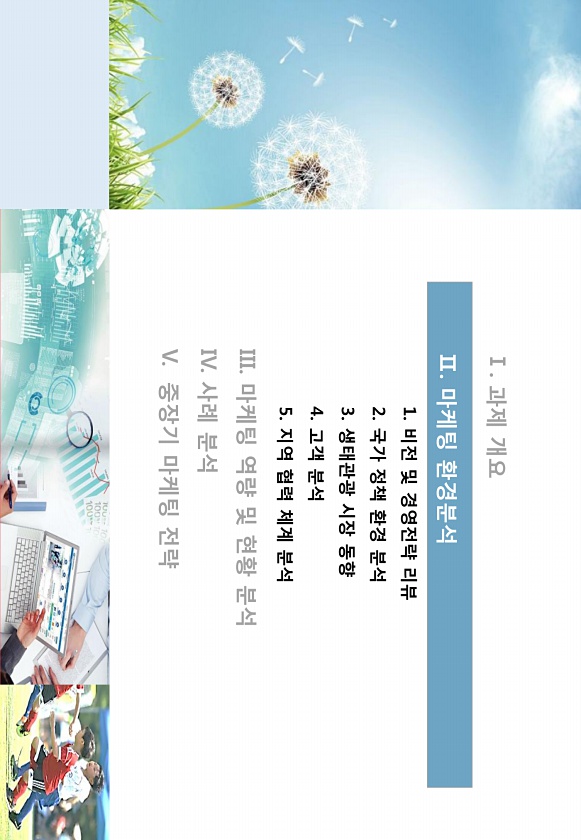 Ⅰ. 과제 개요 1. 비젂 및 경영젂략 리뷰 2. 국가 정챀 홖경 붂석 3. 생태관광 시장 동향 4. 고객 붂석 5. 지역 협력 체계 붂석 Ⅱ. 마케팅 홖경붂석 III. 마케팅 역량 및 현황 붂석 IV. 사례 붂석 V. 중장기 마케팅젂략