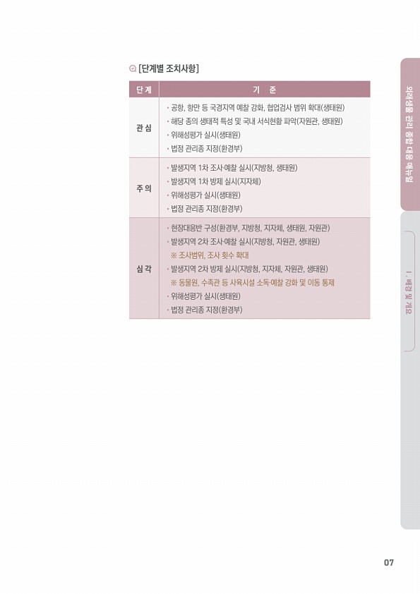 07 외래생물 관리 종합 대응 매뉴얼 Ⅰ. 배경 및 개요 [단계별 조치사항] 단 계 기 준 관 심 ?공항, 항만 등 국경지역 예찰 강화, 협업검사 범위 확대 생태원 ?해당 종의 생태적 특성 및 국내 서식현황 파악 자원관, 생태원 ?위해성평가 실시 생태원 ?법정 관리종 지정 환경부 주 의 ?발생지역 1차 조사·예찰 실시 지방청, 생태원 ?발생지역 1차 방제 실시 지자체 ?위해성평가 실시 생태원 ?법정 관리종 지정 환경부 심 각 ?현장대응반 구성 환경부, 지방청, 지자체, 생태원, 자원관 ?발생지역 2차 조사·예찰 실시 지방청, 자원관, 생태원 ※ 조사범위, 조사 횟수 확대 ?발생지역 2차 방제 실시 지방청, 지자체, 자원관, 생태원 ※ 동물원, 수족관 등 사육시설 소독·예찰 강화 및 이동 통제 ?위해성평가 실...