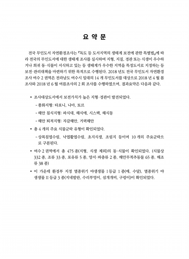전국 무인도서 자연환경조사는 『독도 등 도서지역의 생태계 보전에 관한 특별법』에 따 라 전국의 무인도서에 대한 생태계 조사를 실시하여 지형, 지질, 경관 또는 식생이 우수하 거나 희귀 동·식물이 서식하고 있는 등 생태계가 우수한 지역을 특정도서로 지정하는 등 보전·관리대책을 마련하기 위한 목적으로 수행된다. 2018 년도 전국 무인도서 자연환경 조사 여수 2 권역은 전라남도 여수시 일대의 14 개 무인도서를 대상으로 2018 년 4 월 봄 조사와 2018 년 6 월 여름조사의 2 회 조사를 수행하였으며, 결과요약은 다음과 같다. ? 조사대상도서에서 보전가치가 높은 지형·경관이 발견되었다. 풍화지형타포니, 나마, 토르 해안 침식지형파식대, 해식애, 시스택, 해식동 해안 퇴적지형자갈해안, 거력해안 ? 총 4 개...