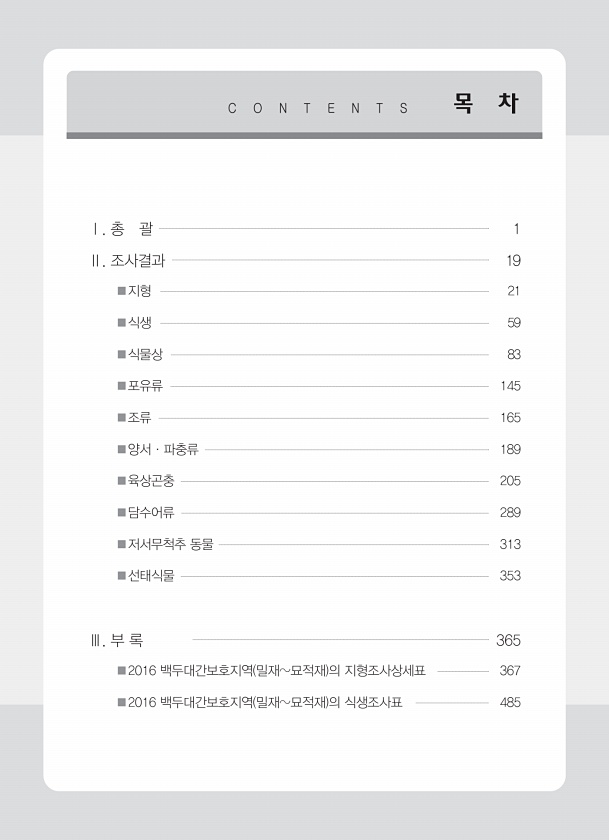 C O N T E N T S ? Ⅰ. 총 괄 1 Ⅱ. 조사결과 19 ■지형 21 ■식생 59 ■식물상 83 ■포유류 145 ■조류 165 ■양서·파충류 189 ■육상곤충 205 ■담수어류 289 ■저서무척추 동물 313 ■선태식물 353 Ⅲ. 부 록 365 ■2016 백두대간보호지역 밀재묘적재 의 지형조사상세표 367 ■2016 백두대간보호지역 밀재묘적재 의 식생조사표485
