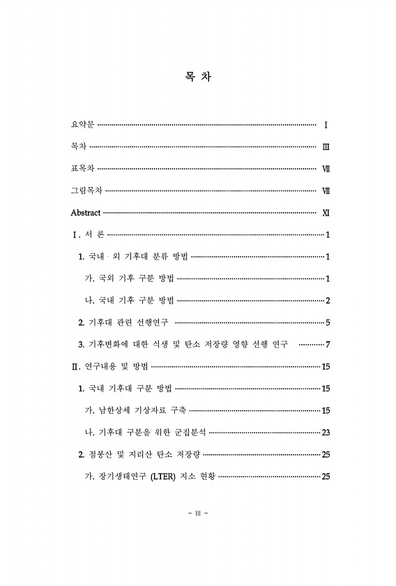 III 목 차 요약문 목차 표목차 그림목차 서 론 국내?외 기후대 분류 방법 가 국외 기후 구분 방법 나 국내 기후 구분 방법 기후대 관련 선행연구 기후변화에 대한 식생 및 탄소 저장량 영향 선행 연구 연구내용 및 방법 국내 기후대 구분 방법 가 남한상세 기상자료 구축 나 기후대 구분을 위한 군집분석 점봉산 및 지리산 탄소 저장량 가 장기생태연구 지소현황