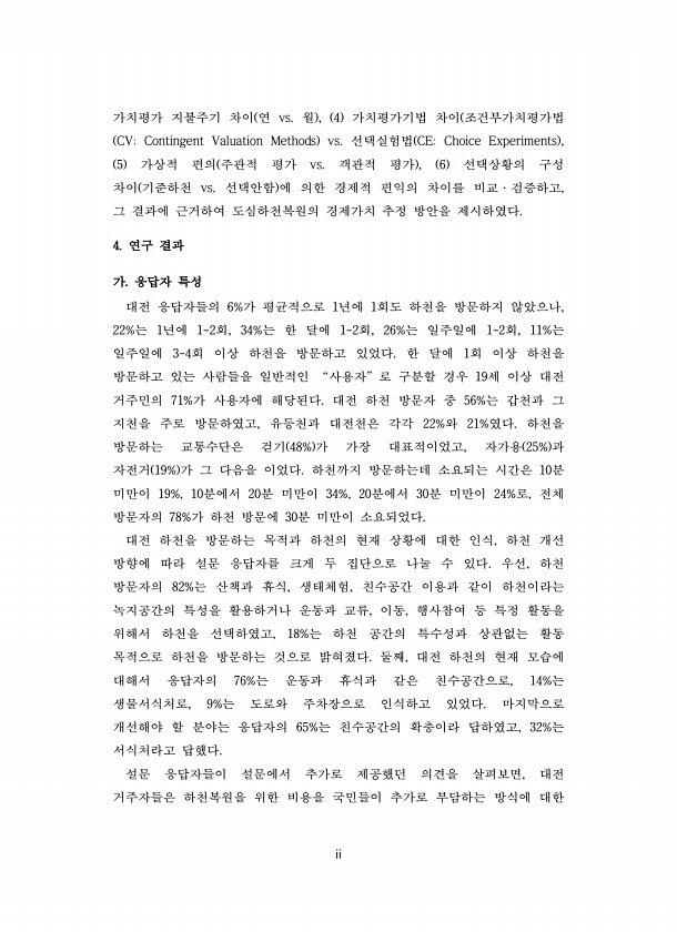 ii 가치평가 지불주기 차이 연 vs. 월 , 4 가치평가기법 차이 조건부가치평가법 CVContingent Valuation Methods vs. 선택실험법 CEChoice Experiments , 5 가상적 편의 주관적 평가 vs. 객관적 평가 , 6 선택상황의 구성 차이 기준하천 vs. 선택안함 에 의한 경제적 편익의 차이를 비교·검증하고, 그 결과에 근거하여 도심하천복원의 경제가치 추정 방안을 제시하였다. 4. 연구 결과 가. 응답자 특성 대전 응답자들의 6%가 평균적으로 1년에 1회도 하천을 방문하지 않았으나, 22%는 1년에 1-2회, 34%는 한 달에 1-2회, 26%는 일주일에 1-2회, 11%는 일주일에 3-4회 이상 하천을 방문하고 있었다. 한 달에 1회 이상 하천을 방문하고 있는 사람들을 ...