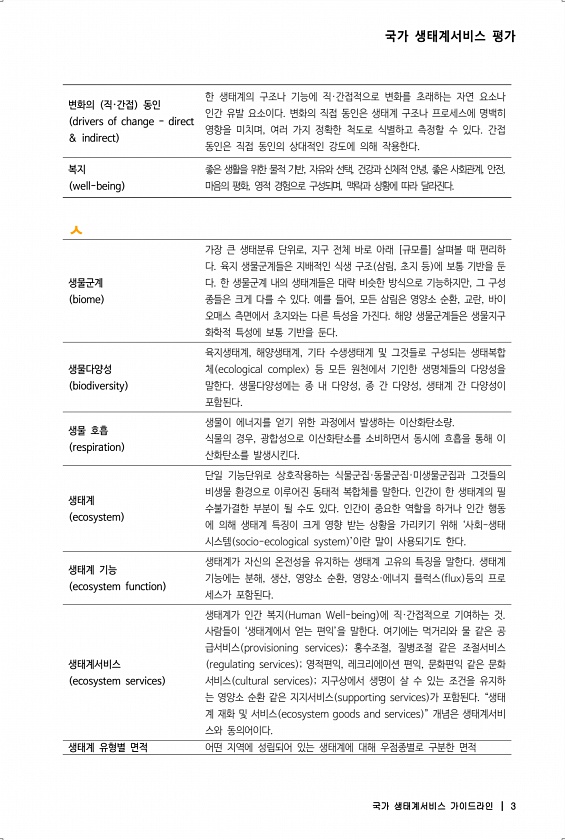 국가 생태계서비스 평가 국가 생태계서비스 가이드라인 ┃ 3 변화의 직·간접 동인 drivers of change direct & indirect 한 생태계의 구조나 기능에 직·간접적으로 변화를 초래하는 자연 요소나 인간 유발 요소이다. 변화의 직접 동인은 생태계 구조나 프로세스에 명백히 영향을 미치며, 여러 가지 정확한 척도로 식별하고 측정할 수 있다. 간접 동인은 직접 동인의 상대적인 강도에 의해 작용한다. 복지 well-being 좋은 생활을 위한 물적 기반, 자유와 선택, 건강과 신체적 안녕, 좋은 사회관계, 안전, 마음의 평화, 영적 경험으로 구성되며, 맥락과 상황에 따라 달라진다. ㅅ 생물군계 biome 가장 큰 생태분류 단위로, 지구 전체 바로 아래 [규모를] 살펴볼 때 편리하 다. 육지 생물군계...