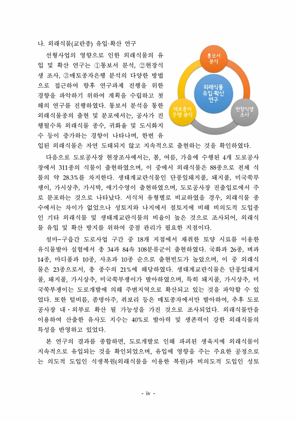 나 외래식물 교란종 유입 확산 연구 선형사업의 영향으로 인한 외래식물의 유 입 및 확산 연구는 통보서 분석 현장식 생 조사 매토종자은행 분석의 다양한 방법 으로 접근하여 향후 연구과제 진행을 위한 경향을 파악하기 위하여 계획을 수립하고 첫 해의 연구를 진행하였다 통보서 분석을 통한 외래식물종의 출현 및 분포에서는 공사가 진 행될수록 외래식물 종수 귀화율 및 도시화지 수 등이 증가하는 경향이 나타나며 한번 유 입된 외래식물은 자연 도태되지 않고 지속적으로 출현하는 것을 확인하였다 다음으로 도로공사장 현장조사에서는 봄 여름 가을에 수행된 개 도로공사 장에서 종의 식물이 출현하였으며 이 중에서 외래식물은 종으로 전체 식 물의 약 를 차지한다 생태계교란식물인 단풍잎돼지풀 돼지풀 미국쑥부 쟁이 가시상추 가시박 애기수...