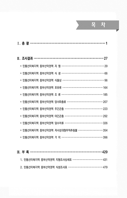 목 차 Ⅰ. 총 괄 ··································································································1 Ⅱ. 조사결과 ···························································································27 ? 민통선이북지역 중부산악권역 지 형 ·································································29 ? 민통선이북지역 중부산악권역 식 생 ·································································66 ? 민통선이북지역...