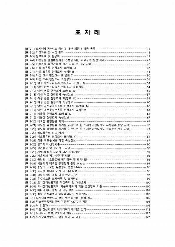 표 차 례 [표 2-1] 도시생태현황지도 작성에 대한 최종 성과품 목록 ·········································································· 11 [표 2-2] 기초자료 및 수집 출처 ·························································································································· 13 [표 2-3] 참고자료 및 활용처 ····················································································································...