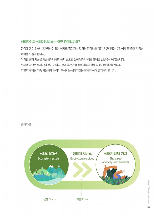 생태자산과 생태계서비스는 어떤 관계일까요? 통장에 돈이 많을수록 받을 수 있는 이자도 많아지는 것처럼 건강하고 다양한 생태계는 우리에게 질 좋고 다양한 혜택을 되돌려 줍니다. 이러한 생태 자산을 훼손하거나 관리하지 않으면 질이 낮거나 적은 혜택을 받을 수밖에 없습니다. 현재의 자연은 우리만의 것이 아니라, 우리 후손인 미래세대들과 함께 나누어야 할 자산입니다. 자연의 혜택을 지속 가능하게 누리기 위해서는 생태자산을 잘 관리하여 유지해야 합니다. 생태자산 근원 Stocks 흐름 Flows 생태 계 자산 Ecosystem assets 생태계 혜택 가치 The value of ecosystem benefits 생태계 서비스 Ecosystem services 05 생태계서비스 간이평가_2017군산
