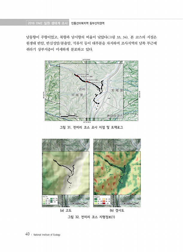 2016 DMZ 일원 생태계 조사 민통선이북지역 동부산악권역 40 ? National Institute of Ecology 남동향이 주향이었고, 북향과 남서향의 비율이 낮았다 그림 33, 34 본 코스의 지질은 원생대 반암, 반심성암/분출암, 석류석 등이 대부분을 차지하며 조사지역의 남쪽 부근에 쥐라기 상부지층이 미세하게 분포하고 있다. 그림 31. 천미리 코스 조사 지점 및 트랙로그 a 고도 b 경사도 그림 32. 천미리 코스 지형정보 1