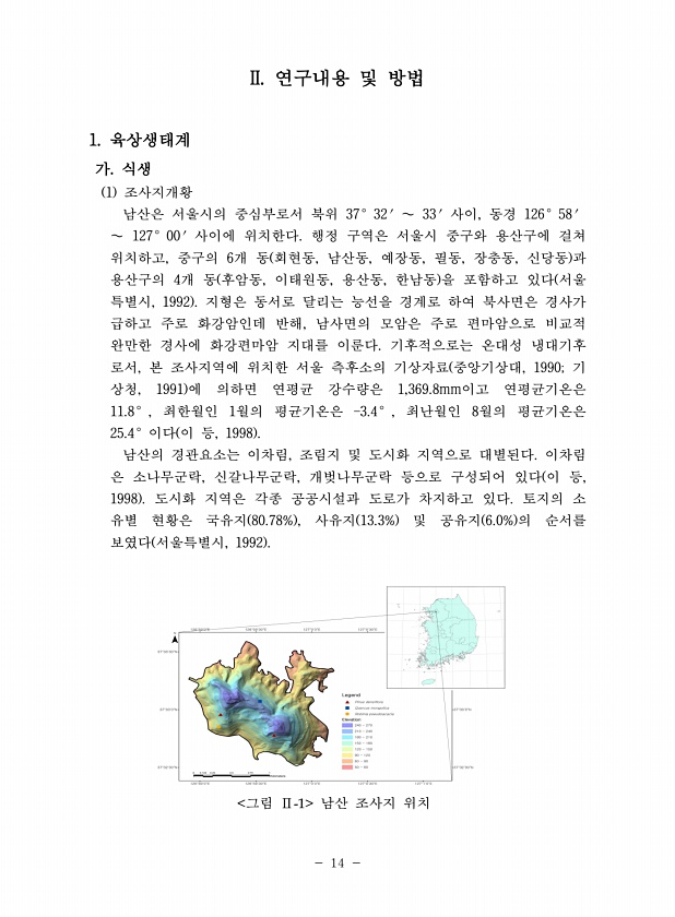 14 II. 연구내용 및 방법 1. 육상생태계 가. 식생 1 조사지개황 남산은 서울시의 중심부로서 북위 37°32′∼ 33′사이, 동경 126°58′ ∼ 127°00′사이에 위치한다. 행정 구역은 서울시 중구와 용산구에 걸쳐 위치하고, 중구의 6개 동 회현동, 남산동, 예장동, 필동, 장충동, 신당동 과 용산구의 4개 동 후암동, 이태원동, 용산동, 한남동 을 포함하고 있다 서울 특별시, 1992 지형은 동서로 달리는 능선을 경계로 하여 북사면은 경사가 급하고 주로 화강암인데 반해, 남사면의 모암은 주로 편마암으로 비교적 완만한 경사에 화강편마암 지대를 이룬다. 기후적으로는 온대성 냉대기후 로서, 본 조사지역에 위치한 서울 측후소의 기상자료 중앙기상대, 1990; 기 상청, 1991 에 의하면 연평균 강수량...