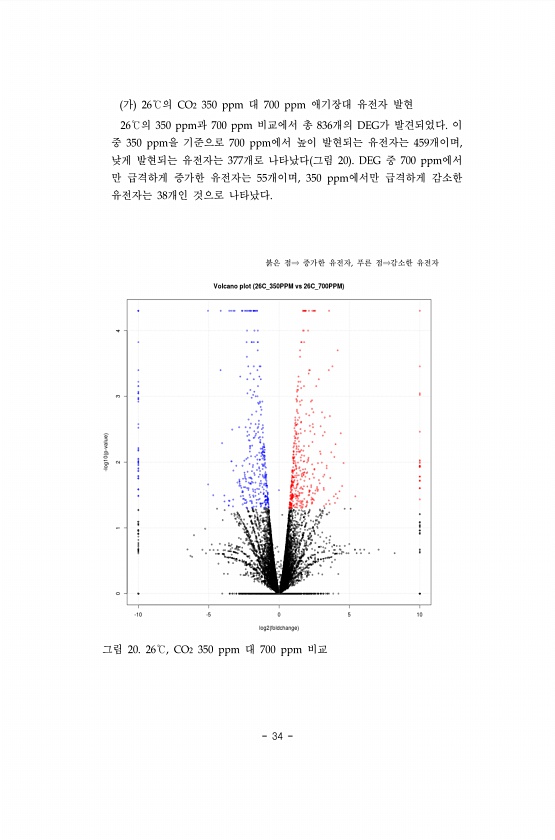 34 붉은 점⇒ 증가한 유전자, 푸른 점⇒감소한 유전자 그림 20. 26℃, CO2 350 ppm 대 700 ppm 비교 가 26℃의 CO2 350 ppm 대 700 ppm 애기장대 유전자 발현 26℃의 350 ppm과 700 ppm 비교에서 총 836개의 DEG가 발견되었다. 이 중 350 ppm을 기준으로 700 ppm에서 높이 발현되는 유전자는 459개이며, 낮게 발현되는 유전자는 377개로 나타났다 그림 20 DEG 중 700 ppm에서 만 급격하게 증가한 유전자는 55개이며, 350 ppm에서만 급격하게 감소한 유전자는 38개인 것으로나타났다.