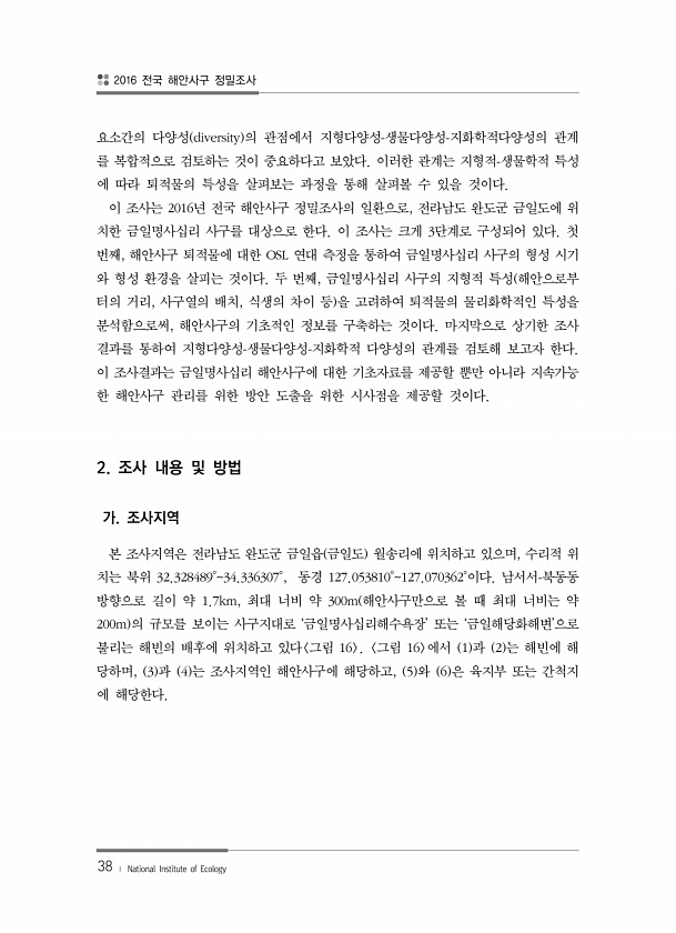 2016 전국 해안사구 정밀조사 38 ? National Institute of Ecology 요소간의 다양성 diversity 의 관점에서 지형다양성-생물다양성-지화학적다양성의 관계 를 복합적으로 검토하는 것이 중요하다고 보았다. 이러한 관계는 지형적-생물학적 특성 에 따라 퇴적물의 특성을 살펴보는 과정을 통해 살펴볼 수 있을 것이다. 이 조사는 2016년 전국 해안사구 정밀조사의 일환으로, 전라남도 완도군 금일도에 위 치한 금일명사십리 사구를 대상으로 한다. 이 조사는 크게 3단계로 구성되어 있다. 첫 번째, 해안사구 퇴적물에 대한 OSL 연대 측정을 통하여 금일명사십리 사구의 형성 시기 와 형성 환경을 살피는 것이다. 두 번째, 금일명사십리 사구의 지형적 특성 해안으로부 터의 거리, 사구열의 배치, 식...