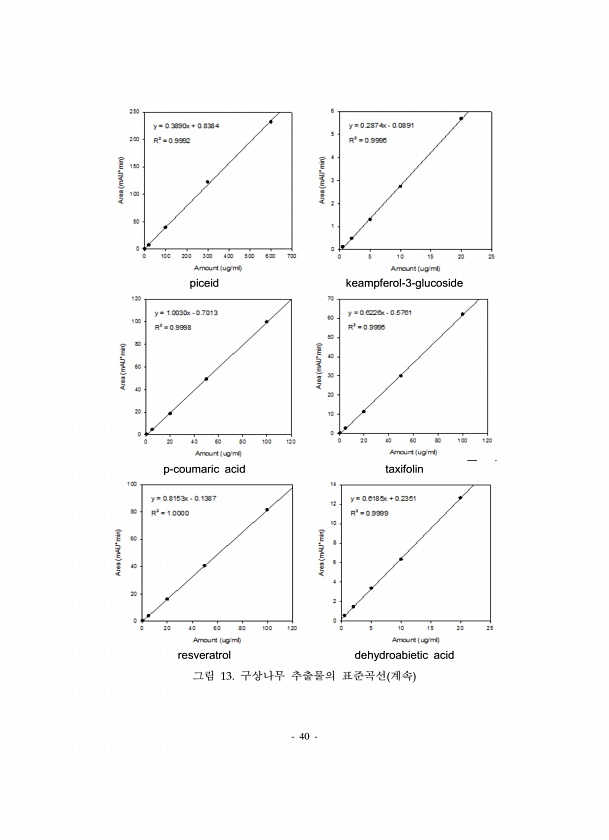 40 piceid keampferol-3-glucoside p-coumaric acid taxifolin resveratrol dehydroabietic acid 그림 13. 구상나무 추출물의 표준곡선 계속