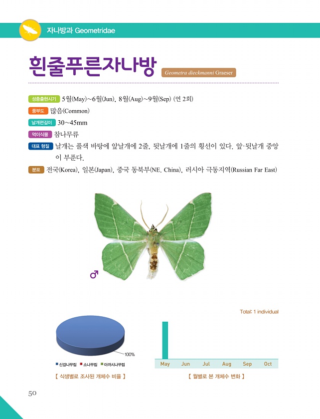 50 자나방과 Geometridae 성충출현시기 5월 May 6월 Jun , 8월 Aug 9월 Sep 연 2회 풍부도 많음 Common 날개편길이 3045mm 먹이식물 참나무류 대표 형질 날개는 풀색 바탕에 앞날개에 2줄, 뒷날개에 1줄의 횡선이 있다. 앞·뒷날개 중앙 이 부푼다. 분포 전국 Korea , 일본 Japan , 중국 동북부 NE. China , 러시아 극동지역 Russian Far East 흰줄푸른자나방 Geometra dieckmanni Graeser 【 식생별로 조사된 개체수 비율 】 100% 신갈나무림 소나무림 아까시나무림 【 월별로 본 개체수 변화 】 Total1 individual May Jun Jul Aug SepOct