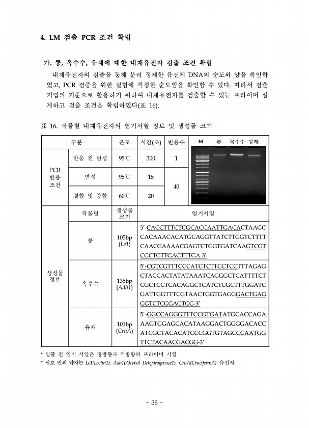 4. LM 검출 PCR 조건 확립 가. 콩, 옥수수, 유채에 대한 내재유전자 검출 조건 확립 내재유전자의 검출을 통해 분리 정제한 유전체 DNA의 순도와 양을 확인하 였고, PCR 검증을 위한 실험에 적정한 순도임을 확인할 수 있다. 따라서 검출 기법의 기준으로 활용하기 위하여 내재유전자를 검출할 수 있는 프라이머 설 계하고 검출 조건을 확립하였다 표 16 표 16. 작물별 내재유전자의 염기서열 정보 및 생성물 크기 구분 온도 시간 초 반응수 PCR 반응 조건 반응 전 변성 95℃ 300 1 변성 95℃ 15 40 결합 및 중합 60℃ 20 생성물 정보 작물명 생성물 크기 염기서열 콩 105bp Le1 5-CACCTTTCTCGCACCAATTGACACTAAGC CACAAACACATGCAGGTTATCTTGGTC...
