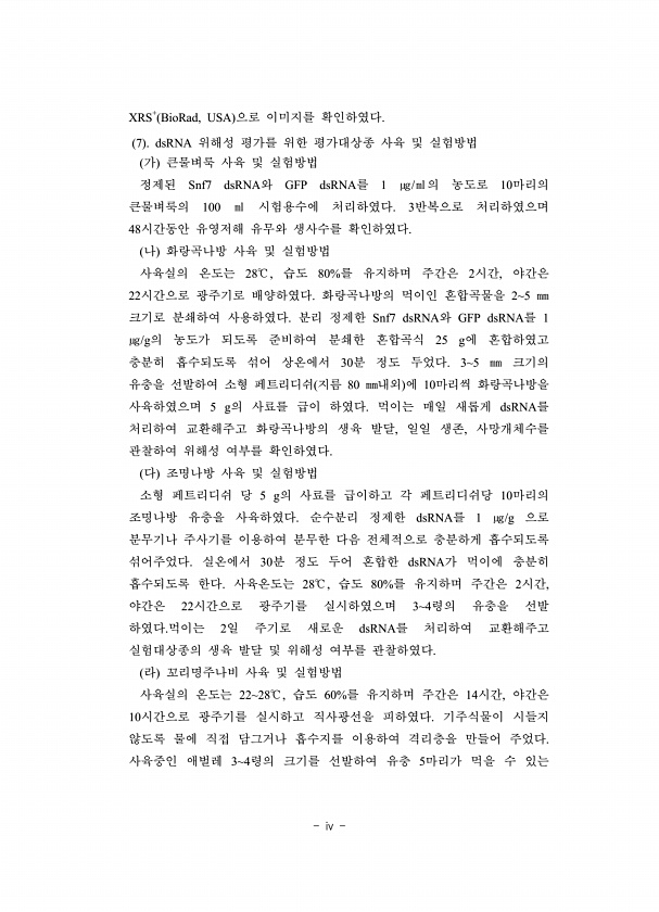 iv XRS+ BioRad, USA 으로 이미지를 확인하였다. 7 dsRNA 위해성 평가를 위한 평가대상종 사육 및 실험방법 가 큰물벼룩 사육 및 실험방법 정제된 Snf7 dsRNA와 GFP dsRNA를 1 ㎍/㎖의 농도로 10마리의 큰물벼룩의 100 ㎖ 시험용수에 처리하였다. 3반복으로 처리하였으며 48시간동안 유영저해 유무와 생사수를 확인하였다. 나 화랑곡나방 사육 및 실험방법 사육실의 온도는 28℃ , 습도 80%를 유지하며 주간은 2시간, 야간은 22시간으로 광주기로 배양하였다. 화랑곡나방의 먹이인 혼합곡물을 25 ㎜ 크기로 분쇄하여 사용하였다. 분리 정제한 Snf7 dsRNA와 GFP dsRNA를 1 ㎍/g의 농도가 되도록 준비하여 분쇄한 혼합곡식 25 g에 혼합하였고 충분히 흡수되도록 섞어 상온에...