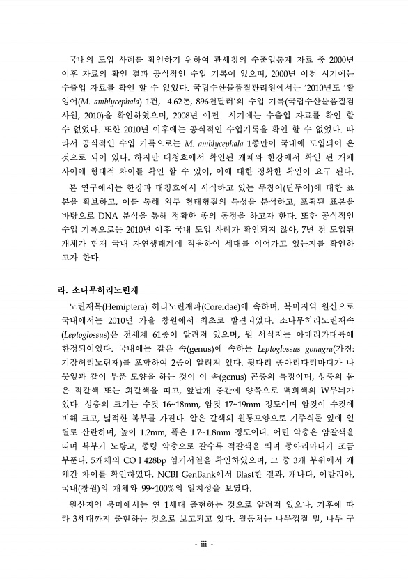 iii 국내의 도입 사례를 확인하기 위하여 관세청의 수출입통계 자료 중 2000년 이후 자료의 확인 결과 공식적인 수입 기록이 없으며, 2000년 이전 시기에는 수출입 자료를 확인 할 수 없었다. 국립수산물품질관리원에서는 ‘2010년도 ‘활 잉어 M. amblycephala 1건, 4.62톤, 896천달러’의 수입 기록 국립수산물품질검 사원, 2010 을 확인하였으며, 2008년 이전 시기에는 수출입 자료를 확인 할 수 없었다. 또한 2010년 이후에는 공식적인 수입기록을 확인 할 수 없었다. 따 라서 공식적인 수입 기록으로는 M. amblycephala 1종만이 국내에 도입되어 온 것으로 되어 있다. 하지만 대청호에서 확인된 개체와 한강에서 확인 된 개체 사이에 형태적 차이를 확인 할 수 있어, 이에 대한...