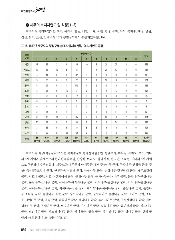 ? 제주의 녹지자연도 및 식생 Ⅰ-3 제주도의 녹지자연도는 제주, 서귀포, 한림, 애월, 구좌, 조천, 한경, 추자, 우도, 북제주, 대정, 남원, 성산, 안덕, 표선, 남제주의 16개 행정구역에서 수행되었다 표 16 표 16. 1989년 제주도의 행정구역별 조사당시의 명칭 녹지자연도 등급 행정 구역 등급 메쉬 수 합계 1 2 3 4 5 6 7 8 9 10 0 제주 18 86 2 31 45 10 9 29 25 3 0 258 서귀포 12 51 40 5 54 11 4 28 4.3 8 0 256 한림 4 41 0 6 32 3 7 0 0 0 0 93 애월 5 66 0 9 72 6 7 28 9 2 0 204 구좌 8 54 0 11 116 1 2 0 0 0 0 192 조천 3 34 6 15 51 5 19 15 6 0 ...
