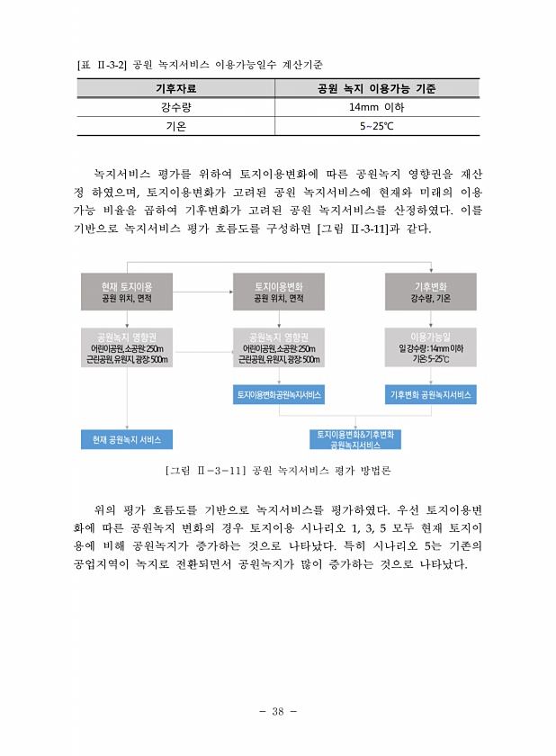 38 기후자료 공원 녹지 이용가능 기준 강수량 14mm 이하 기온 5∼25℃ [표 Ⅱ-3-2] 공원 녹지서비스 이용가능일수 계산기준 녹지서비스 평가를 위하여 토지이용변화에 따른 공원녹지 영향권을 재산 정 하였으며, 토지이용변화가 고려된 공원 녹지서비스에 현재와 미래의 이용 가능 비율을 곱하여 기후변화가 고려된 공원 녹지서비스를 산정하였다. 이를 기반으로 녹지서비스 평가 흐름도를 구성하면 [그림 Ⅱ-3-11]과 같다. [그림 Ⅱ-3-11] 공원 녹지서비스 평가 방법론 위의 평가 흐름도를 기반으로 녹지서비스를 평가하였다. 우선 토지이용변 화에 따른 공원녹지 변화의 경우 토지이용 시나리오 1, 3, 5 모두 현재 토지이 용에 비해 공원녹지가 증가하는 것으로 나타났다. 특히 시나리오 5는 기존의 공업지역이 녹지로 ...