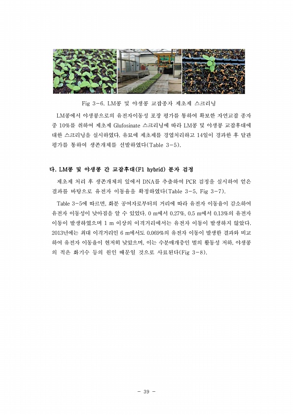 39 Fig 3-6. LM콩 및 야생콩 교잡종자 제초제 스크리닝 LM콩에서 야생콩으로의 유전자이동성 포장 평가를 통하여 확보한 자연교잡 종자 중 10%를 취하여 제초제 Glufosinate 스크리닝에 따라 LM콩 및 야생콩 교잡후대에 대한 스크리닝을 실시하였다. 유묘에 제초제를 경엽처리하고 14일이 경과한 후 달관 평가를 통하여 생존개체를 선발하였다 Table 3-5 다. LM콩 및 야생콩 간 교잡후대 F1 hybrid 분자 검정 제초제 처리 후 생존개체의 잎에서 DNA를 추출하여 PCR 검정을 실시하여 얻은 결과를 바탕으로 유전자 이동율을 확정하였다 Table 3-5, Fig 3-7 Table 3-5에 따르면, 화분 공여자로부터의 거리에 따라 유전자 이동율이 감소하여 유전자 이동성이 낮아짐을 알 수 있었다...