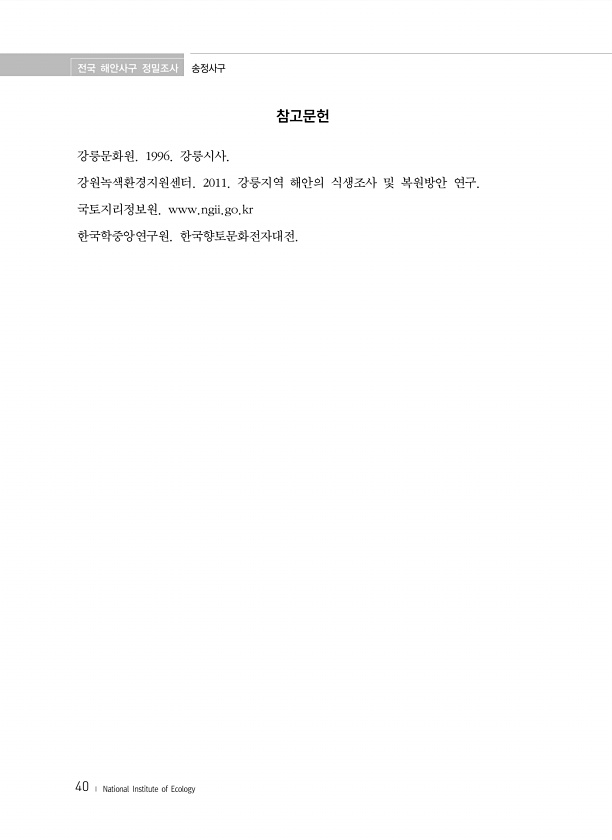 전국 해안사구 정밀조사 송정사구 40 ? National Institute of Ecology 참고문헌 강릉문화원. 1996. 강릉시사. 강원녹색환경지원센터. 2011. 강릉지역 해안의 식생조사 및 복원방안 연구. 국토지리정보원. www.ngii.go.kr 한국학중앙연구원.한국향토문화전자대전.