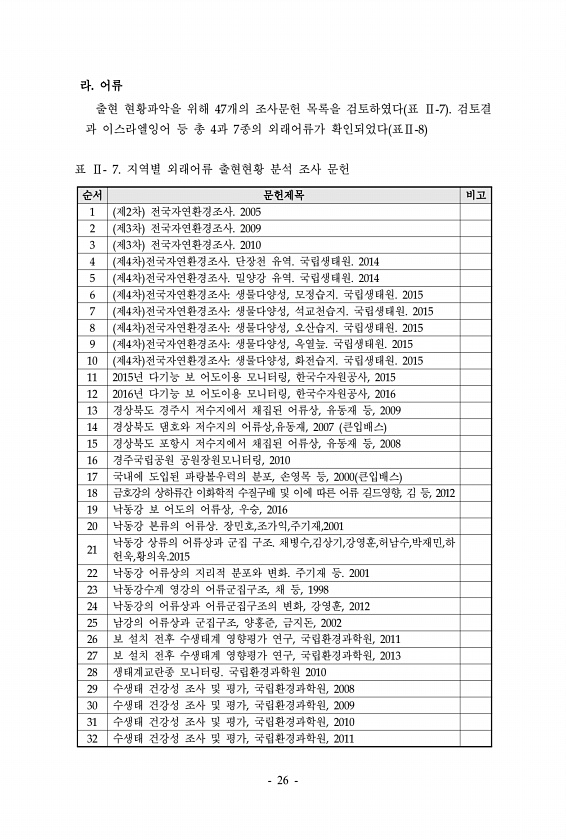 순서 문헌제목 비고 1 제2차 전국자연환경조사. 2005 2 제3차 전국자연환경조사. 2009 3 제3차 전국자연환경조사. 2010 4 제4차 전국자연환경조사. 단장천 유역. 국립생태원. 2014 5 제4차 전국자연환경조사. 밀양강 유역. 국립생태원. 2014 6 제4차 전국자연환경조사생물다양성, 모정습지. 국립생태원. 2015 7 제4차 전국자연환경조사생물다양성, 석교천습지. 국립생태원. 2015 8 제4차 전국자연환경조사생물다양성, 오산습지. 국립생태원. 2015 9 제4차 전국자연환경조사생물다양성, 옥열늪. 국립생태원. 2015 10 제4차 전국자연환경조사생물다양성, 화전습지. 국립생태원. 2015 11 2015년 다기능 보 어도이용 모니터링, 한국수자원공사, 2015 12 2016년 다기능 보 어도이...