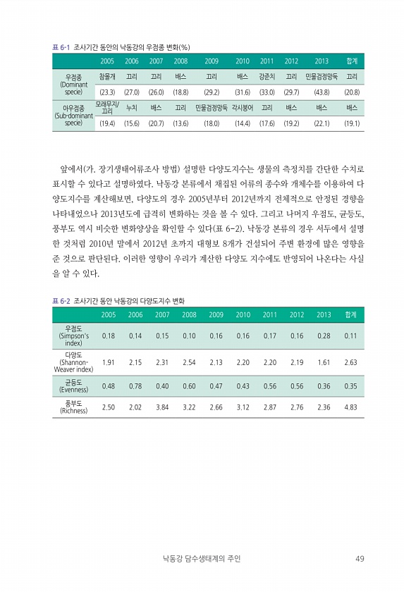 낙동강 담수생태계의 주인 49 표 6-1 조사기간 동안의 낙동강의 우점종 변화 % 표 6-2 조사기간 동안 낙동강의 다양도지수 변화 앞에서 가. 장기생태어류조사 방법 설명한 다양도지수는 생물의 측정치를 간단한 수치로 표시할 수 있다고 설명하였다. 낙동강 본류에서 채집된 어류의 종수와 개체수를 이용하여 다 양도지수를 계산해보면, 다양도의 경우 2005년부터 2012년까지 전체적으로 안정된 경향을 나타내었으나 2013년도에 급격히 변화하는 것을 볼 수 있다. 그리고 나머지 우점도, 균등도, 풍부도 역시 비슷한 변화양상을 확인할 수 있다 표 6-2 낙동강 본류의 경우 서두에서 설명 한 것처럼 2010년 말에서 2012년 초까지 대형보 8개가 건설되어 주변 환경에 많은 영향을 준 것으로 판단된다. 이러한 영향이 우...