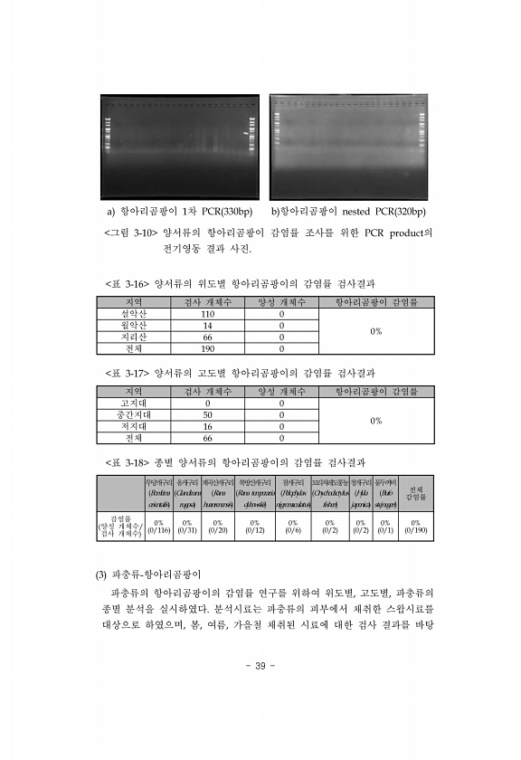 39 a 항아리곰팡이 1차 PCR 330bp b 항아리곰팡이 nested PCR 320bp 그림 3-10 양서류의 항아리곰팡이 감염률 조사를 위한 PCR product의 전기영동 결과 사진. 지역 검사 개체수 양성 개체수 항아리곰팡이 감염률 설악산 110 0 월악산 14 0 0% 지리산 66 0 전체 190 0 표 3-16 양서류의 위도별 항아리곰팡이의 감염률 검사결과 지역 검사 개체수 양성 개체수 항아리곰팡이 감염률 고지대 0 0 중간지대 50 0 0% 저지대 16 0 전체 66 0 표 3-17 양서류의 고도별 항아리곰팡이의 감염률 검사결과 무당개구리 Bombina orientalis 옴개구리 Glandirana rugosa 계곡산개구리 Rana huanrenensis 북방산개구리 Rana temporar...