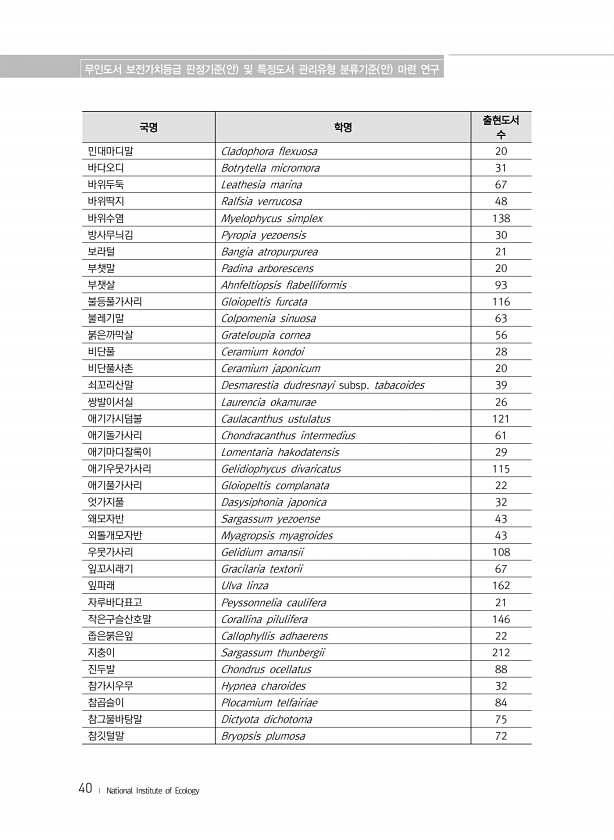 무인도서 보전가치등급 판정기준 안 및 특정도서 관리유형 분류기준 안 마련 연구 40 ? National Institute of Ecology 국명 학명 출현도서 수 민대마디말 Cladophora flexuosa 20 바다오디 Botrytella micromora 31 바위두둑 Leathesia marina 67 바위딱지 Ralfsia verrucosa 48 바위수염 Myelophycus simplex 138 방사무늬김 Pyropia yezoensis 30 보라털 Bangia atropurpurea 21 부챗말 Padina arborescens 20 부챗살 Ahnfeltiopsis flabelliformis 93 불등풀가사리 Gloiopeltis furcata 116 불레기말 Colpomenia sinuosa...