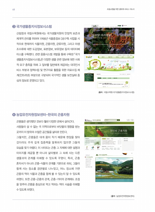 ? 국가생물종지식정보시스템 산림청과 국립수목원에서는 국가생물자원의 안정적 보존과 체계적 관리를 위하여 1998년 식물종정보 DB구축 사업을 시 작으로 현재까지 식물자원, 곤충자원, 균류자원, 그리고 야생 조수류에 대한 도감정보, 표본정보, 보유정보 등의 데이터베 이스를 구축했다. 관련 응용시스템 개발을 통해 구축된 「국가 생물종지식정보시스템」은 다양한 생물 관련 정보에 대한 사회 적 요구 충족을 위해 그 일부를 일반에게 제공하는 대국민서 비스 부분과 정책수립 및 연구자료 활용을 위한 자료수집 체 계 인트라넷 부분으로 구분되어 국가적인 생물 보전실태 중 심의 정보로 운영되고 있다. 출처 국립수목원 국가생물종지식정보시스템 ? 농업유전자원정보센터-한국의 곤충자원 곤충들은 생각했던 것보다 훨씬 다양한 곳에서 살아간...