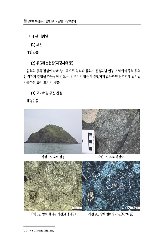 2018 특정도서 정밀조사 신안 1 남부권역 36 ? National Institute of Ecology 1 해당없음 2 암석의 풍화 진행에 따라 장기적으로 침식과 풍화가 진행되면 일부 지역에서 중력에 의 한 사태가 진행될 가능성이 있으나, 인위적인 훼손이 진행되지 않는다면 단기간에 일어날 가능성은 높아 보이지 않음. 3 해당없음 사진 17. 오도 전경 사진 18. 오도 안산암 사진 19. 암석 현미경 사진 개방니콜 사진 20. 암석 현미경 사진 직교니콜