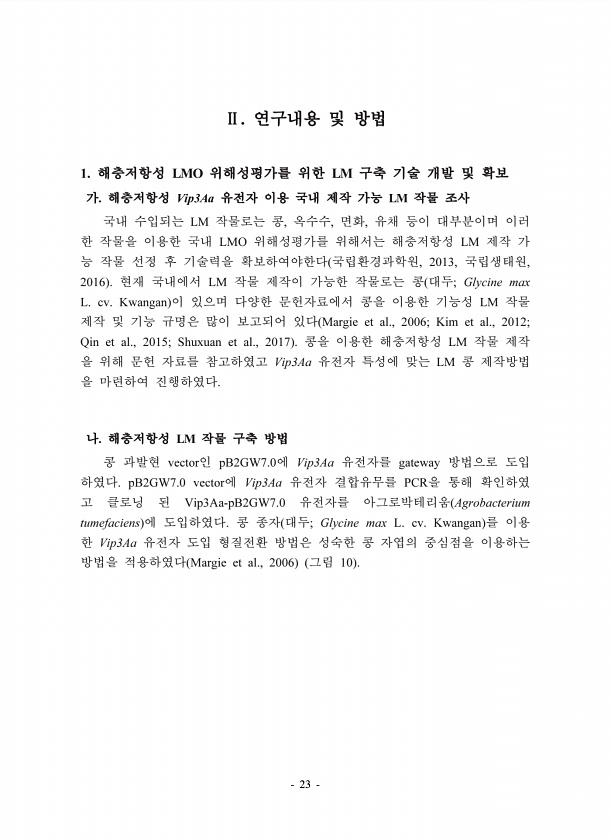 23 1. LMO LM Vip3Aa LM LM , , , LMO LM , 2013, , 2016 LM ; Glycine max L. cv. Kwangan LM Margie et al., 2006; Kim et al., 2012; Qin et al., 2015; Shuxuan et al., 2017 LM Vip3Aa LM LM vector pB2GW7.0 Vip3Aa gateway pB2GW7.0 vector Vip3Aa PCR Vip3Aa-pB2GW7.0 Agrobacterium tumefaciens ; Glycine max L. cv. Kwangan Vip3Aa Margie et al., 2006 10