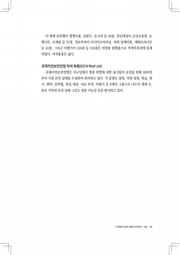 13 멸종위기종의 현황과 보전방안 ? 식물 49 이 밖에 준위협이 깽깽이풀, 담팔수, 손고비 등 56종, 관심대상이 금강초롱꽃, 눈 향나무, 모새달 등 97종, 정보부족이 다시마고사리삼, 여뀌 잎제비꽃, 매화오리나무 등 40종, 그리고 미평가가 126종 등 319종은 비멸종 위협종으로 적색목록집에 등재 되었다. 미적용종은 없다. 국제자연보전연맹 적색 목록 IUCN Red List 국제자연보전연맹은 지구상에서 멸종 위험에 처한 동식물의 보전을 위해 1963년 부터 각종 보전 상태를 수집하여 관리하고 있다. 각 종별로 절멸, 야생 절멸, 위급, 위 기, 취약, 준위협, 관심 대상, 자료 부족, 비평가 등 9개의 그룹으로 나누어 개체 수, 분포 지역과 보전 상태 그리고 멸종 가능성 등을 평가하고있다.