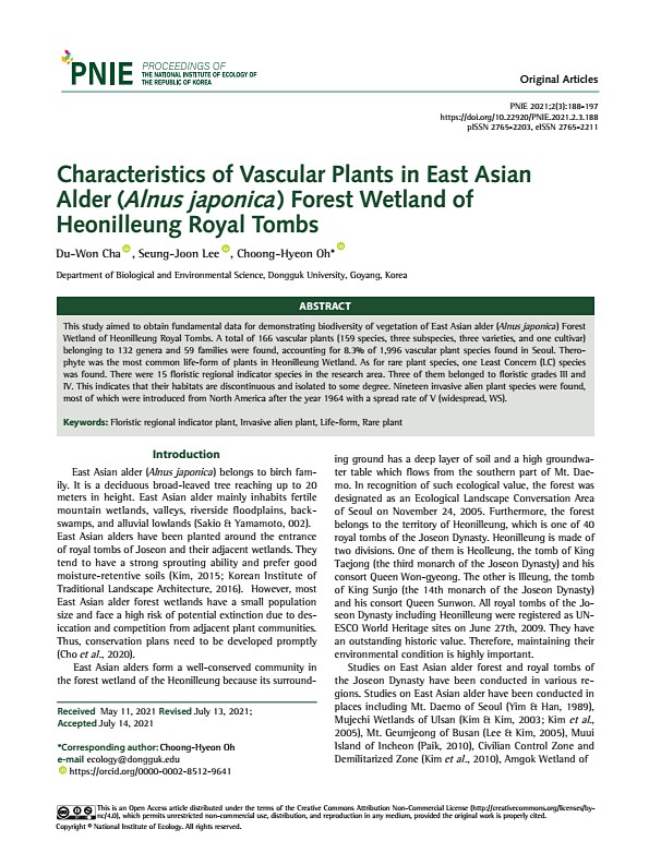 Du-Won Cha , Seung-Joon Lee , Choong-Hyeon Oh* Characteristics of Vascular Plants in East Asian Alder Alnus japonica Forest Wetland of Heonilleung Royal Tombs ABSTRACT Introduction This study aimed to obtain fundamental data for demonstrating biodiversity of vegetation of East Asian alder Alnus japonica Forest Wetland of Heonilleung Royal Tombs. A total of 166 vascular plants 159 species, three su...