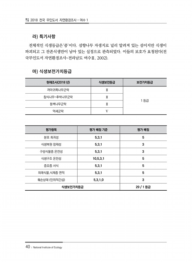 2018 전국 무인도서 자연환경조사 여수 1 40 ? National Institute of Ecology 전체적인 식생등급은‘중’이다. 섬향나무 자생지로 널리 알려져 있는 섬이지만 식생이 파괴되고 그 잔존식생만이 남아 있는 실정으로 관측되었다. 이들의 보호가 요청된다 전 국무인도서 자연환경조사-전라남도 여수Ⅱ, 2002 현재조사 2018 년 식생보전등급 보전가치등급 까마귀쪽나무군락 Ⅱ 1 등급 참식나무-후박나무군락 Ⅱ 동백나무군락 Ⅱ 억새군락 Ⅴ 평가항목 평가 배점 기준 평가 배점 분포 희귀성 5,3,1 5 식생복원 잠재성 5,3,1 3 구성식물종 온전성 5,3,1 3 식생구조 온전성 10,5,3,1 5 중요종 서식 5,3,1 5 외래식물,식재종 면적 5,3,1 5 훼손상태 인위적간섭 5,3,1,0 3 식...