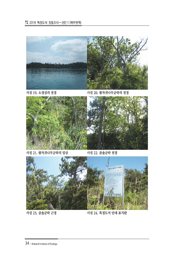 2018 특정도서 정밀조사 신안 1 북부권역 34 ? National Institute of Ecology 사진 19. 소정섬의 전경 사진 20. 왕자귀나무군락의 전경 사진 21. 왕자귀나무군락의 임상 사진 22. 곰솔군락 전경 사진 23. 곰솔군락 근경 사진 24. 특정도서 안내표지판