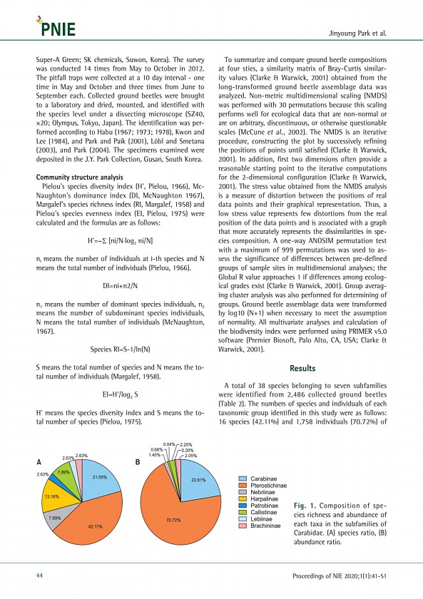 Jinyoung Park et al. 44 Proceedings of NIE 2020;1 1 41-51 Super-A Green; SK chemicals, Suwon, Korea The survey was conducted 14 times from May to October in 2012. The pitfall traps were collected at a 10 day interval one time in May and October and three times from June to September each. Collected ground beetles were brought to a laboratory and dried, mounted, and identified with the species leve...
