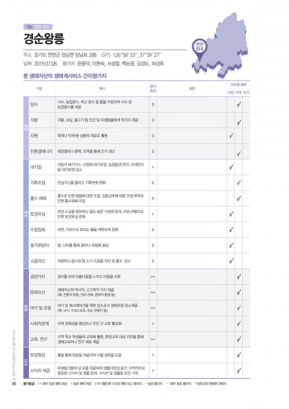 No. 연천- 연천 019 본 생태자산의 생태계서비스 간이평가지 구분 예시 평가 등급 설명 규모별 혜택 지점 지역 국가 공급 담수 식수, 농업용수, 축산 용수 등 물을 저장하여 식수 및 농업용수를 제공 0 √ 식량 곡물, 과실, 물고기 등 인간 및 야생동물에게 먹거리 제공 0 √ 자원 목재나 약재 등 상품의 재료로 활용 0 √ 친환경에너지 태양열이나 풍력, 조력을 통해 전기 생산 0 √ 조절 대기질 자동차 배기가스, 산업체 대기오염, 농업발생 먼지, 미세먼지 등 대기오염 감소 + √ 기후조절 온실가스를 줄이고 기후변화 완화 0 √ 홍수 재해 홍수로 인한 범람에 대한 조절, 집중강우에 대한 조절 폭우로 인한 홍수피해 저감 0 √ 토양유실 토양 소실을 방어하는 밀도 높은 식생의 존재, 비와 바람으로 인한 토양유...