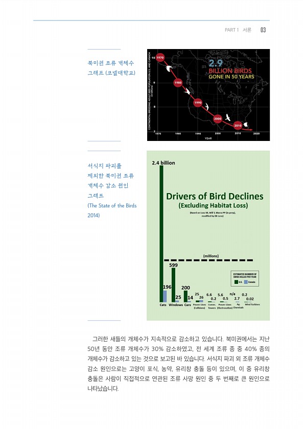 그러한 새들의 개체수가 지속적으로 감소하고 있습니다. 북미권에서는 지난 50년 동안 조류 개체수가 30% 감소하였고, 전 세계 조류 종 중 40% 종의 개체수가 감소하고 있는 것으로 보고된 바 있습니다. 서식지 파괴 외 조류 개체수 감소 원인으로는 고양이 포식, 농약, 유리창 충돌 등이 있으며, 이 중 유리창 충돌은 사람이 직접적으로 연관된 조류 사망 원인 중 두 번째로 큰 원인으로 나타났습니다. 북미권 조류 개체수 그래프 코넬대학교 서식지 파괴를 제외한 북미권 조류 개체수 감소 원인 그래프 The State of the Birds 2014 PART 1 서론03