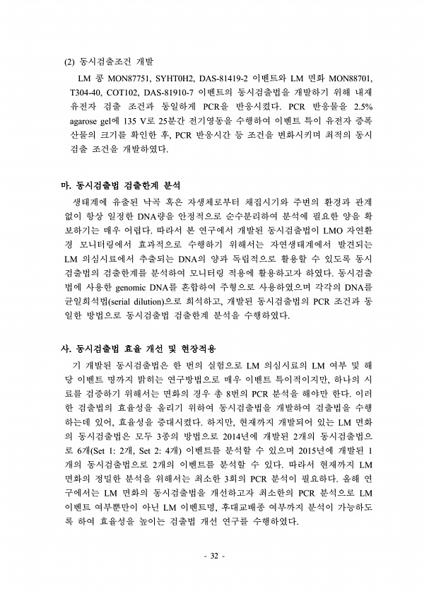 32 2 동시검출조건 개발 LM 콩 MON87751, SYHT0H2, DAS-81419-2 이벤트와 LM 면화 MON88701, T304-40, COT102, DAS-81910-7 이벤트의 동시검출법을 개발하기 위해 내재 유전자 검출 조건과 동일하게 PCR을 반응시켰다. PCR 반응물을 2.5% agarose gel에 135 V로 25분간 전기영동을 수행하여 이벤트 특이 유전자 증폭 산물의 크기를 확인한 후, PCR 반응시간 등 조건을 변화시키며 최적의 동시 검출 조건을 개발하였다. 마. 동시검출법 검출한계 분석 생태계에 유출된 낙곡 혹은 자생체로부터 채집시기와 주변의 환경과 관계 없이 항상 일정한 DNA량을 안정적으로 순수분리하여 분석에 필요한 양을 확 보하기는 매우 어렵다. 따라서 본 연구에서 개발된 동...