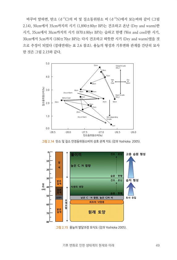 기후 변화로 인한 생태계의 현재와 미래 49 바꾸어 말하면, 탄소 δ13C 의 비 및 질소동위원소 비 δ15N 에서 보는바와 같이 그림 2.14 , 50cm에서 35cm까지의 시기 1,890±80yr BP 는 건조하고 온난 Dry and warm 한 시기, 35cm에서 30cm까지의 시기 870±80yr BP 는 습하고 한랭 Wet and cool 한 시기, 30cm에서 5cm까지 180±70yr BP 는 다시 건조하고 따뜻한 시기 Dry and warm 였을 것 으로 추정이 되었다 절대연대는 표 2.6 참조 용늪의 형성과 기후변화 관계를 간단히 묘사 한 것은 그림 2.15와 같다. 그림 2.15 용늪의 발달과정 모식도 강과 Yoshioka 2005 그림 2.14 탄소 및 질소 안정동위원소비의 상호 관계 지...