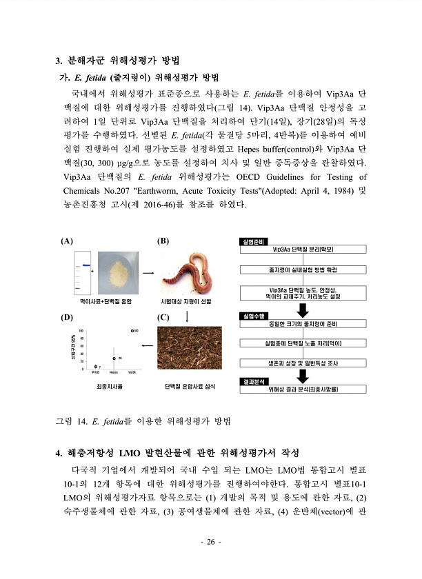 26 3. 분해자군 위해성평가 방법 가. E. fetida 줄지렁이 위해성평가 방법 국내에서 위해성평가 표준종으로 사용하는 E. fetida를 이용하여 Vip3Aa 단 백질에 대한 위해성평가를 진행하였다 그림 14 Vip3Aa 단백질 안정성을 고 려하여 1일 단위로 Vip3Aa 단백질을 처리하여 단기 14일 , 장기 28일 의 독성 평가를 수행하였다. 선별된 E. fetida 각 물질당 5마리, 4반복 를 이용하여 예비 실험 진행하여 실제 평가농도를 설정하였고 Hepes buffer control 와 Vip3Aa 단 백질 30, 300 μg/g으로 농도를 설정하여 치사 및 일반 중독증상을 관찰하였다. Vip3Aa 단백질의 E. fetida 위해성평가는 OECD Guidelines for Testing of ...