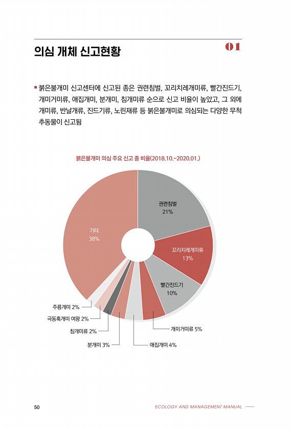 50 ECOLOGY AND MANAGEMENT MANUAL ■ 붉은불개미 신고센터에 신고된 종은 권련침벌, 꼬리치레개미류, 빨간진드기, 개미거미류, 애집개미, 분개미, 침개미류 순으로 신고 비율이 높았고, 그 외에 개미류, 반날개류, 진드기류, 노린재류 등 붉은불개미로 의심되는 다양한 무척 추동물이 신고됨 의심 개체 신고현황 01 붉은불개미 의심 주요 신고 종 비율 2018.10.2020.01. 권련침벌 21% 꼬리치레개미류 13% 빨간진드기 10% 개미거미류 5% 분개미 3% 애집개미 4% 침개미류 2% 극동혹개미 여왕 2% 주름개미 2% 기타38%
