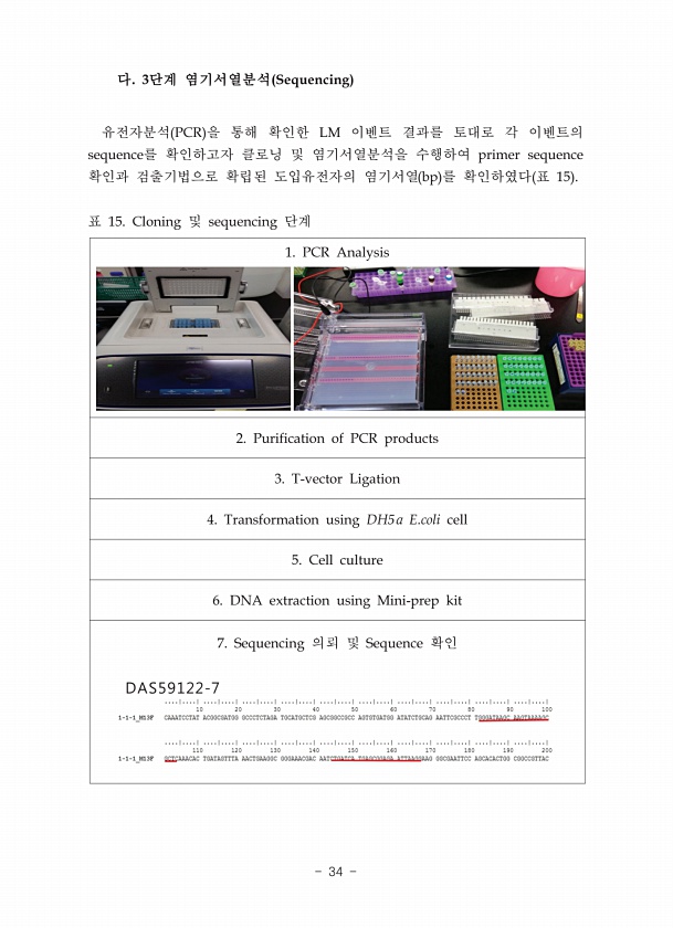 다. 3단계 염기서열분석 Sequencing 유전자분석 PCR 을 통해 확인한 LM 이벤트 결과를 토대로 각 이벤트의 sequence를 확인하고자 클로닝 및 염기서열분석을 수행하여 primer sequence 확인과 검출기법으로 확립된 도입유전자의 염기서열 bp 를 확인하였다 표 15 표 15. Cloning 및 sequencing 단계 1. PCR Analysis 2. Purification of PCR products 3. T-vector Ligation 4. Transformation using DH5 E.coli cell 5. Cell culture 6. DNA extraction using Mini-prep kit 7. Sequencing 의뢰 및 Sequence확인