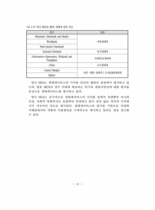 18 영국 일본 Mountains, Moorlands and Heaths Woodlands 산림생태계 Semi-natural Grasslands Enclosed Farmland 농지생태계 Freshwaters?Openwaters, Wetlands and Floodplains 수륙 陸水 생태계 Urban 도시생태계 Coastal Margins 연안·해양 생태계 도서 島嶼 생태계 Marine 표 1-3 영국 NEA와 JBO2 생태계 분류 비교 영국 NEA는 생태계서비스의 가치와 인간의 웰빙의 관점에서 평가하고 있 으며, 일본 JBO2의 경우 미래에 예상되는 위기와 생물다양성에 대한 평가를 중심으로 생태계서비스를 평가하고 있다. 영국 NEA는 궁극적으로 생태계서비스의 가치를 경제적 측면뿐만 아니라 건강, 사회적 ...