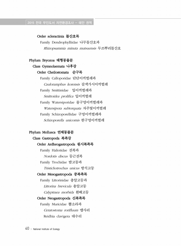 2015 전국 무인도서 자연환경조사 태안 권역 40 ? National Institute of Ecology Order scleractinia 돌산호목 Family Dendrophylliidae 나무돌산호과 Rhizopsammia minuta mutsuensis 무쓰뿌리돌산호 Phylum Bryozoa 태형동물문 Class Gymnolaemata 나후강 Order Cheilostomata 순구목 Family Calloporidae 단단이끼벌레과 Cauloramphus korensis 갈색가시이끼벌레 Family Smittinidae 입이끼벌레과 Smittoidea prolifica 입이끼벌레 Family Watersiporidae 물구멍이끼벌레과 Watersipora subtorquata 자주빛이끼벌레 Fa...