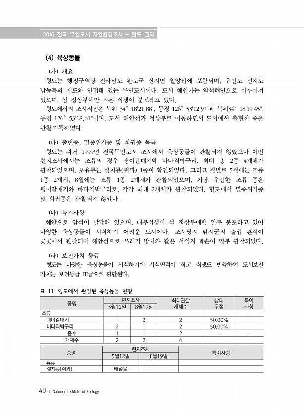 2015 전국 무인도서 자연환경조사 완도 권역 40 ? National Institute of Ecology 4 육상동물 가 개요 형도는 행정구역상 전라남도 완도군 신지면 월양리에 포함되며, 유인도 신지도 남동측의 제도와 인접해 있는 무인도서이다. 도서 해안가는 암석해안으로 이루어져 있으며, 섬 정상부에만 적은 식생이 분포하고 있다. 형도에서의 조사시점은 북위 34°1821.88, 동경 126°5312.97과 북위34°1819.45, 동경 126°5318.61이며, 도서 해안선과 정상부로 이동하면서 도서에서 출현한 종을 관찰?기록하였다. 나 출현종, 멸종위기종 및 희귀종 목록 형도는 과거 1999년 전국무인도서 조사에서 육상동물이 관찰되지 않았으나 이번 현지조사에서는 조류의 경우 괭이갈매기와 바다직박구리, ...