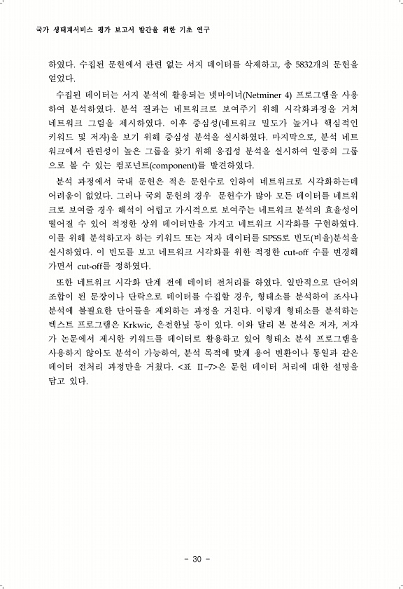 국가 생태계서비스 평가 보고서 발간을 위한 기초 연구 30 하였다. 수집된 문헌에서 관련 없는 서지 데이터를 삭제하고, 총 5832개의 문헌을 얻었다. 수집된 데이터는 서지 분석에 활용되는 넷마이너 Netminer 4 프로그램을 사용 하여 분석하였다. 분석 결과는 네트워크로 보여주기 위해 시각화과정을 거쳐 네트워크 그림을 제시하였다. 이후 중심성 네트워크 밀도가 높거나 핵심적인 키워드 및 저자 을 보기 위해 중심성 분석을 실시하였다. 마지막으로, 분석 네트 워크에서 관련성이 높은 그룹을 찾기 위해 응집성 분석을 실시하여 일종의 그룹 으로 볼 수 있는 컴포넌트 component 를 발견하였다. 분석 과정에서 국내 문헌은 적은 문헌수로 인하여 네트워크로 시각화하는데 어려움이 없었다. 그러나 국외 문헌의 경우 문...
