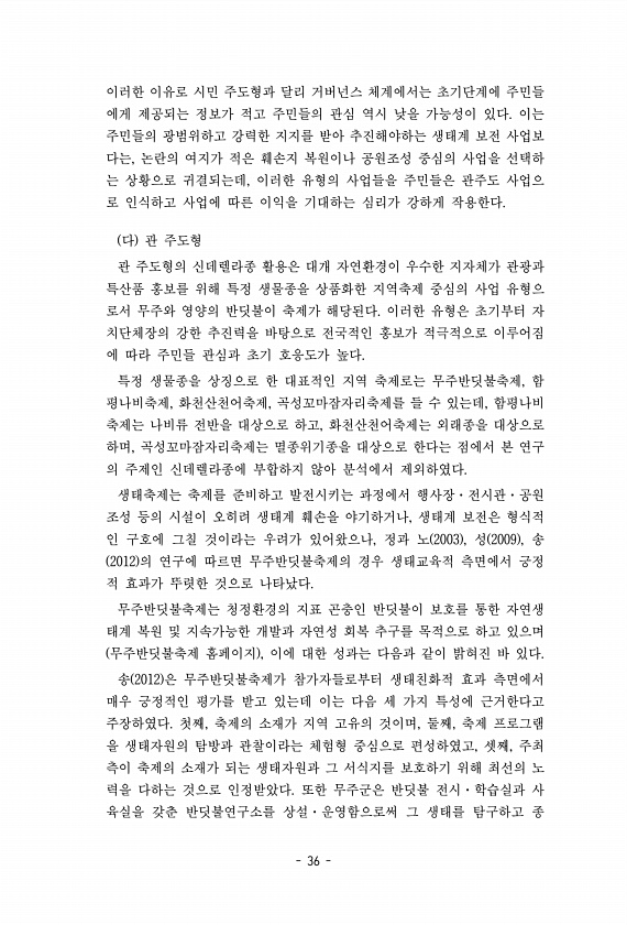 36 이러한 이유로 시민 주도형과 달리 거버넌스 체계에서는 초기단계에 주민들 에게 제공되는 정보가 적고 주민들의 관심 역시 낮을 가능성이 있다. 이는 주민들의 광범위하고 강력한 지지를 받아 추진해야하는 생태계 보전 사업보 다는, 논란의 여지가 적은 훼손지 복원이나 공원조성 중심의 사업을 선택하 는 상황으로 귀결되는데, 이러한 유형의 사업들을 주민들은 관주도 사업으 로 인식하고 사업에 따른 이익을 기대하는 심리가 강하게 작용한다. 다 관 주도형 관 주도형의 신데렐라종 활용은 대개 자연환경이 우수한 지자체가 관광과 특산품 홍보를 위해 특정 생물종을 상품화한 지역축제 중심의 사업 유형으 로서 무주와 영양의 반딧불이 축제가 해당된다. 이러한 유형은 초기부터 자 치단체장의 강한 추진력을 바탕으로 전국적인 홍보가 적극...